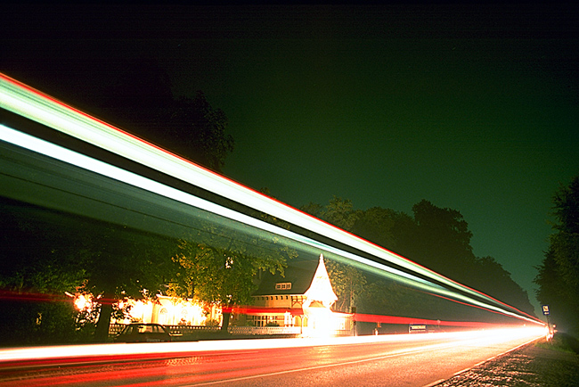 Die Möglichkeiten, Bewegungen darzustellen sind sehr vielseitig. Das Beispielbild zeigt eine Nachtaufnahme, bei der das fotografierte Objekt - ein Auto - gar nicht zu sehen ist. Durch eine sehr lange Belichtungszeit von mehreren Sekunden blieben bei der Aufnahme lediglich die "Spuren" zurück, die die Scheinwerfer des Fahrzeugs hinterlassen haben. Bei solchen Aufnahmen muss die Blende so weit wie möglich geschlossen werden - das bedeutet der Wert muss sehr hoch sein. Ein hoher Blendenwert könnte bei einem Normalobjektiv beispielsweise 22 lauten. Die Beispielaufnahme muss mit einem Stativ gemacht werden. Die Filmempfindlichkeit sollten Sie hier nicht erhöhen - die Belichtungszeit soll bei solchen Aufnahmen ja möglichst lang sein, ohne dass das Foto überbelichtet wird. Durch die lange Belichtungszeit wird der Himmel übrigens "eingefärbt". Eine solch lange Belichtungszeit kann man natürlich nicht aus der freien Hand halten. Als Stativ können Sie natürlich auch einen Gegenstand benutzen. Stellen Sie beispielsweise die Kamera einfach auf das Dach Ihres Autos, das Sie am Straßenrand abgestellt haben.